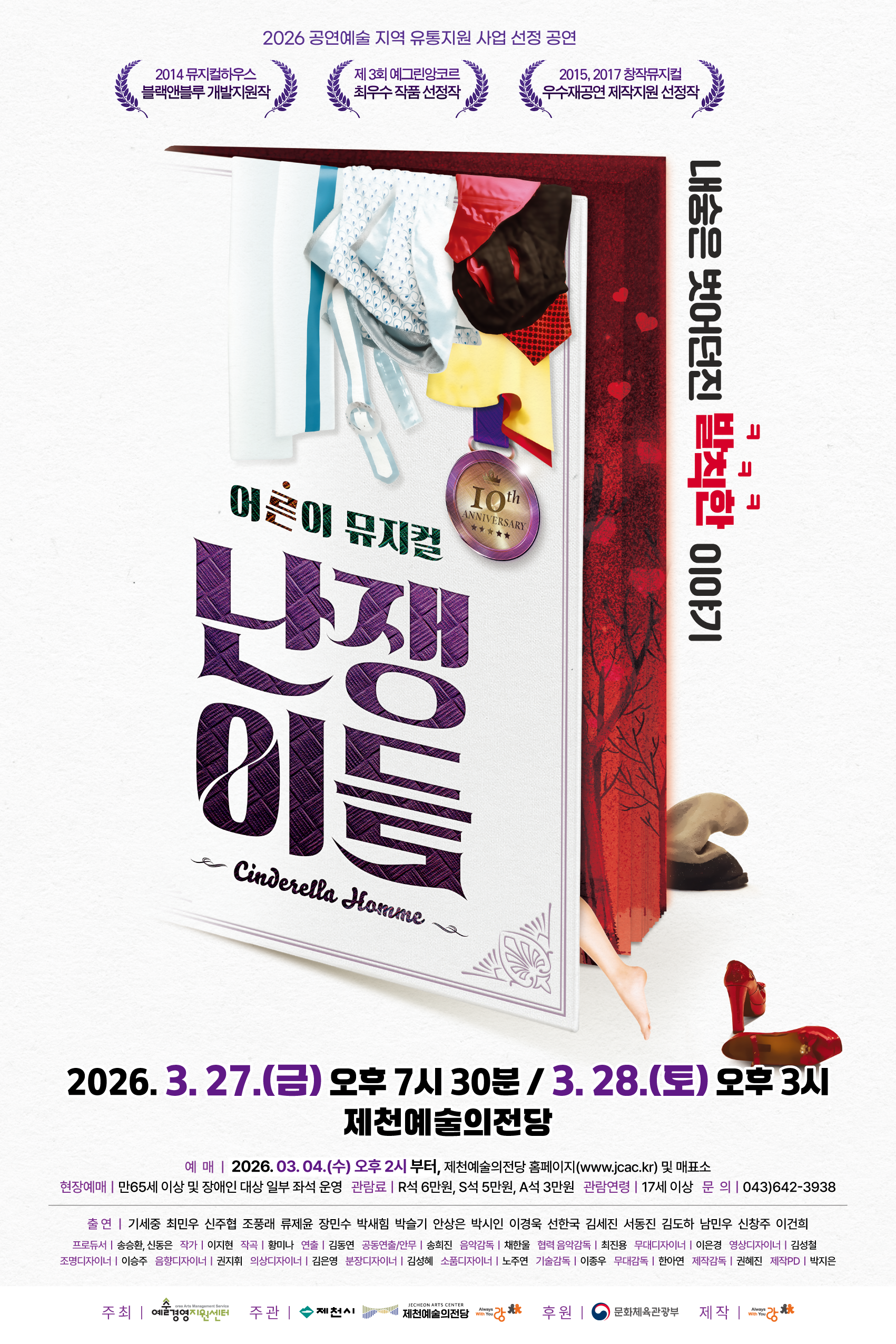 예정 공연 [기획] 난쟁이들 2026 공연예술 지역유통 지원사업으로 선정된 어른이 뮤지컬, 난쟁이들! 공연기간 2026. 03. 27 ~ 2026. 03. 28 관람시간3월 27일(금) 오후 7시 30분 / 3월 28일(토) 오후 3시 진행시간120분 공연금액R석 6만원, S석 5만원, A석 3만원 연령17세 이상 문의043-642-3938 구분기획 장소대공연장 본문 공연 상세 내용 ★티켓오픈 : 3월 4일(수) 오후 2시 ★CAST : 최민우(찰리), 장민수-금요일/류제윤-토(빅), 박슬기(인어공주), 안상은(백설공주), 남민우(신데렐라), 이건희(왕자) 이전화면