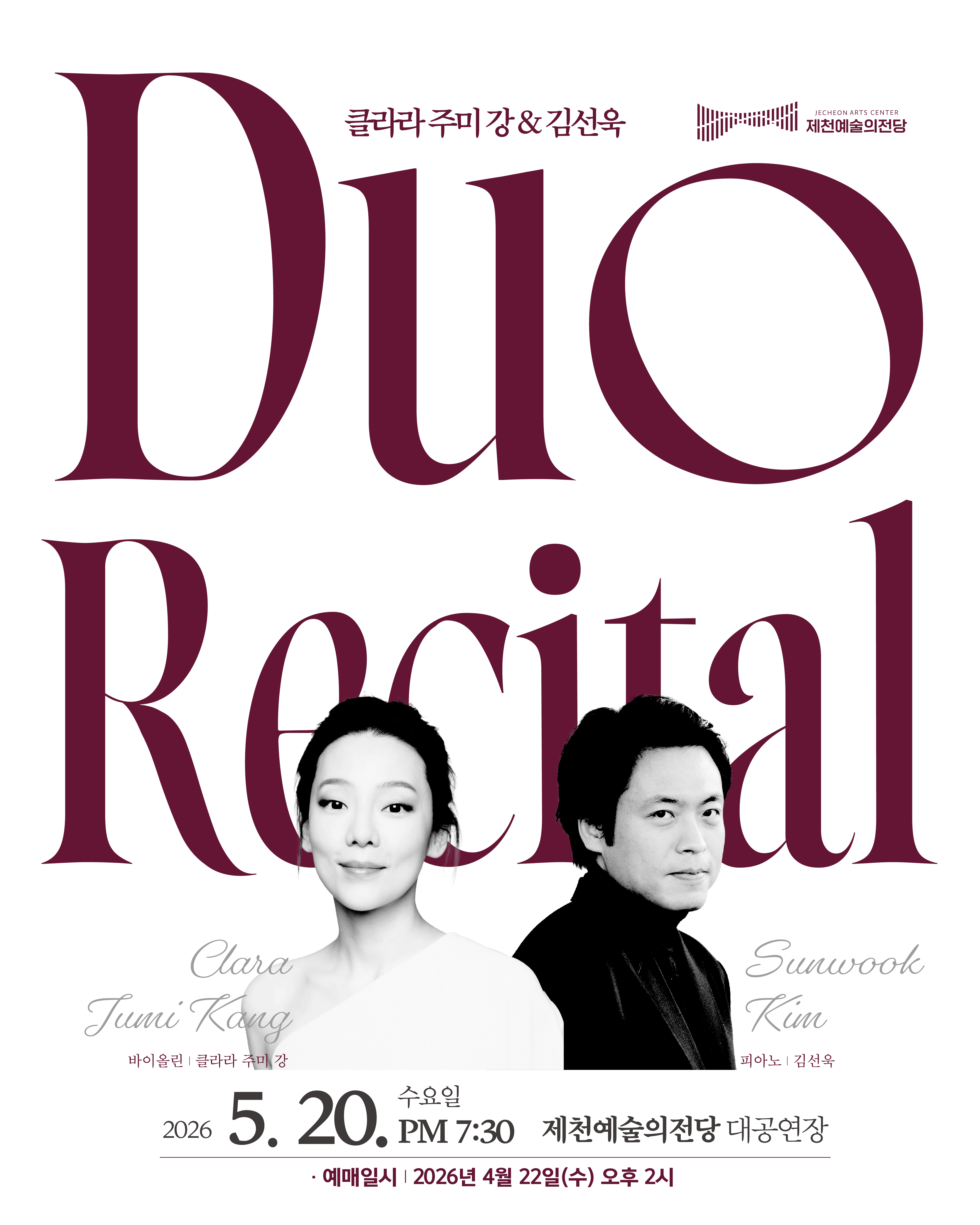 예정 [공연] [기획]클라라 주미 강&김선욱 듀오 리사이틀 대한민국 클래식계의 젊은 거장, 바이올리니스트 클라라 주미 강, 피아니스트 김선욱의 듀오 리사이틀 공연기간 2026. 05. 20 ~ 2026. 05. 20 관람시간오후 7시 30분 진행시간약 100분(인터미션 15분 포함) 공연금액R석 7만원, S석 5만원, A석 3만원 연령8세 이상 관람가 문의043-642-3938(제천예술의전당) 구분기획 장소대공연장 본문 공연 상세 내용 ★티켓오픈 : 2026년 4월 22일(수) 오후 2시부터 이전화면